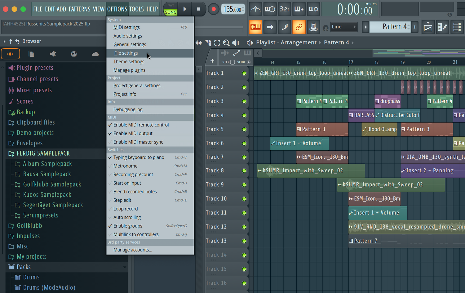 Gå til options i fl studio panelet og trykk så på "File settings".