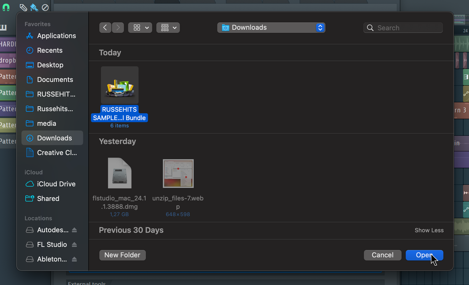 Trykk på den un-zippa samplepacken du vil bruke og klikk "open".